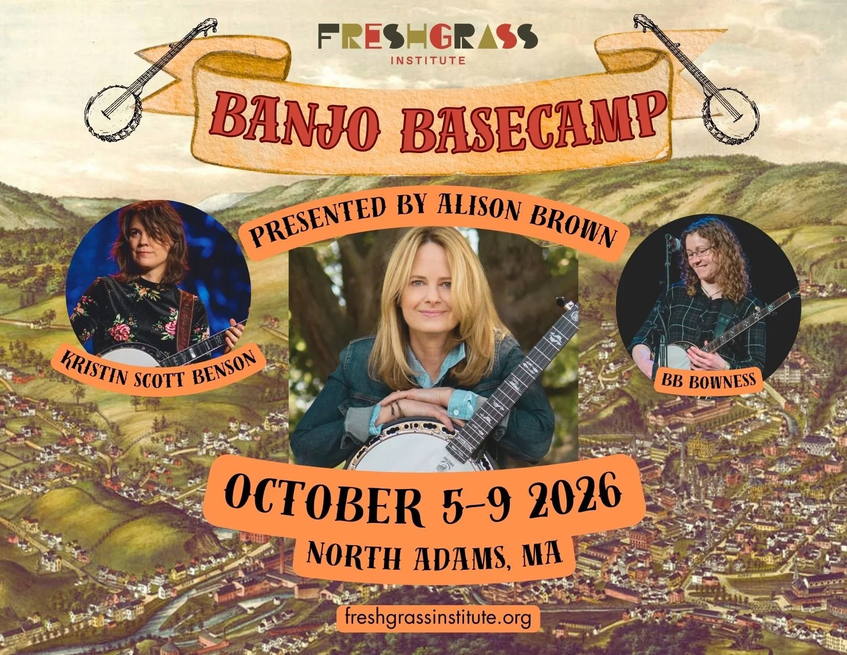 Calling all banjo players! The dates for this year’s Banjo Basecamp are Oct 5-9. We’ll be back at The Porches in North Adams, MA. Two of my favorite players are joining me again as co-instructors: Kristin Scott Benson and BB Bowness. Last year was fantastic; this year promises to be even better. Come up your banjo game in a nurturing and exclusive environment in the Berkshires at the peak of fall foliage season! Click on the button below to register.
